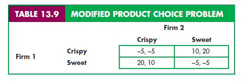 As a simple example, let’s return to the product choice problem first discussed in Section 13.3. This problem involves two companies facing a market in which two new variations of breakfast cereal can be successfully introduced as long as each firm introduces only one variation. This time, let’s change the payoff matrix slightly. As Table 13.9 shows, the new sweet cereal will inevitably be a better seller than the new crispy cereal, earning a profit of 20 rather than 10 (perhaps because consumers prefer sweet things to crispy things). Both new cereals will still be profitable, however, as long as each is introduced by only one firm. (Compare Table 13.9 with Table 13.3—page 493.)