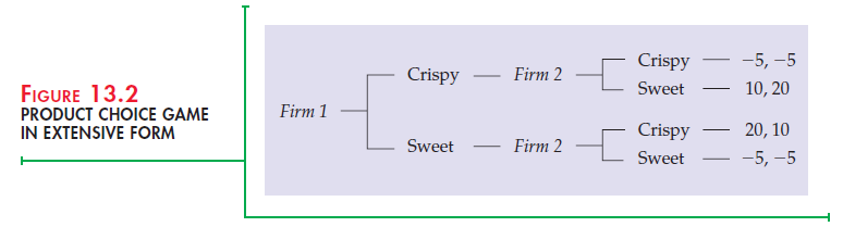 Although this outcome can be deduced from the payoff matrix in Table 13.9, sequential games are sometimes easier to visualize if we represent the pos- sible moves in the form of a decision tree. This representation is called the extensive form of a game and is shown in Figure 13.2. The figure shows the possible choices of Firm 1 (introduce a crispy or a sweet cereal) and the pos- sible responses of Firm 2 to each of those choices. The resulting payoffs are given at the end of each branch. For example, if Firm 1 produces a crispy cereal and Firm 2 responds by also producing a crispy cereal, each firm will have a payoff of – 5.
