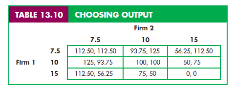 These and a few other possible outcomes are summarized in the payoff matrix in Table 13.10. If both firms move simultaneously, the only solution to the game is that both produce 10 and earn 100. In this Cournot equilibrium each firm is doing the best it can given what its competitor is doing. If Firm 1 moves first, however, it knows that its decision will constrain Firm 2’s choice. Observe from the payoff matrix that if Firm 1 sets Q1 = 7.5, Firm 2’s best response will be to set Q2 = 10. This will give Firm 1 a profit of 93.75 and Firm 2 a profit of 125. If Firm 1 sets Q1 = 10, Firm 2 will set Q2 = 10, and both firms will earn 100. But if Firm 1 sets Q1 = 15, Firm 2 will set Q2 = 7.5, so that Firm 1 earns 112.50, and Firm 2 earns 56.25. Therefore, the most that Firm 1 can earn is 112.50, and it does so by setting Q1 = 15. Compared to the Cournot outcome, when Firm 1 moves first, it does better—and Firm 2 does much worse.