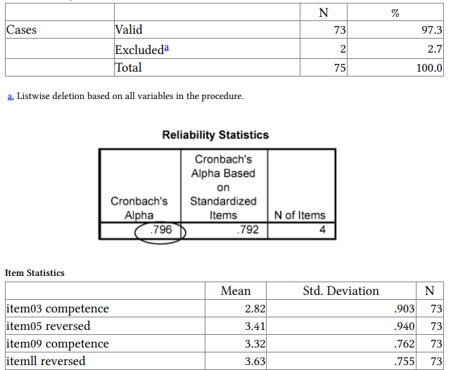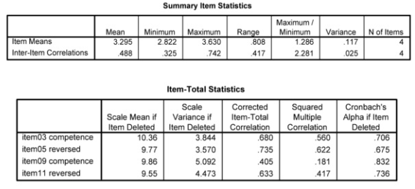 - For the competence scale, use item03, item05 reversed, item09, and itemll reversed.