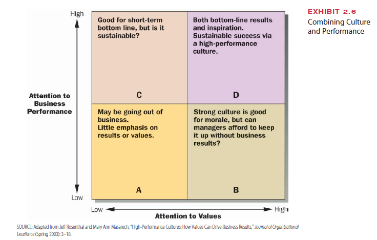 Companies that succeed in a turbulent world are those that pay careful attention to cultural values and business performance. Cultural values can energize and motivate employees by appealing to higher ideals and unifying people around shared goals. In addition, values boost performance by shaping and guiding employee behavior, so that everyone’s actions are aligned with strategic priorities.60 Exhibit 2.6 illustrates four organizational outcomes based on the relative attention managers pay to cultural values and business performance.61