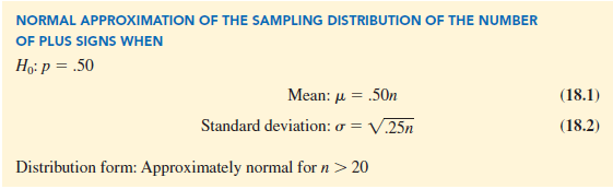 The application we have just described makes use of the binomial distribution with p = .50. The binomial probabilities provided in Table 5 of Appendix B can be used to compute the p-value when the sample size is 20 or less. With larger sample sizes, we rely on the normal distribution approximation of the binomial distribution to compute the p-value; this makes the computations quicker and easier. A large sample application of the sign test is illustrated in the following example.