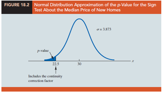The null hypothesis that the population median is greater than or equal to $236,000 is expressed by the binomial distribution hypothesis H0: p > .50. If H0 were true as an equality, we would expect .50(60) = 30 homes to have a plus sign. The sample result showing 22 plus signs is in the lower tail of the binomial distribution. Thus, the p-value is the probability of 22 or fewer plus signs when p = .50. While it is possible to compute the exact binomial probabilities for 0, 1, 2, . . . to 22 and sum these probabilities, we will use the normal distribution approximation of the binomial distribution to make this computation easier. For this approximation, the mean and standard deviation of the normal distribution are as follows: