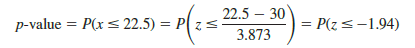 Let us now use the normal distribution to approximate the binomial probability of 22 or fewer plus signs. Before we proceed, remember that the binomial probability distribution is discrete and the normal probability distribution is continuous. To account for this, the binomial probability of 22 is computed by the normal probability interval 21.5 to 22.5. The .5 added to and subtracted from 22 is called the continuity correction factor. Thus, to compute the p-value for 22 or fewer plus signs we use the normal distribution with m = 30 and s = 3.873 to compute the probability that the normal random variable, x, has a value less than or equal to 22.5. A graph of this p-value is shown in Figure 18.2.