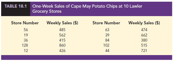 Data showing one-week sales at 10 randomly selected Lawler’s stores are provided in Table 18.1.