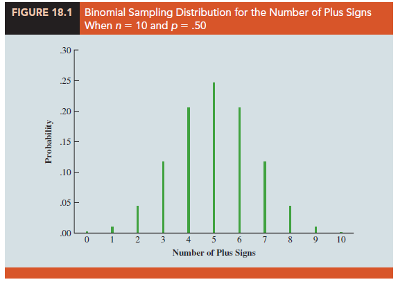 With n = 10 stores or trials and p = .50, we used Table 5 in Appendix B to obtain the binomial probabilities for the number of plus signs under the assumption H0 is true. These probabilities are shown in Table 18.3. Figure 18.1 shows a graphical representation of this binomial distribution.