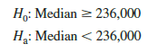One year ago the median price of a new home was $236,000. However, a current downturn in the economy has real estate firms using sample data on recent home sales to determine if the population median price of a new home is less today than it was a year ago. The hypothesis test about the population median price of a new home is as follows: