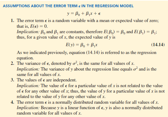 At this point, we must keep in mind that we are also making an assumption or hypothesis about the form of the relationship between x and y. That is, we assume that a straight line represented by β0 + β1x is the basis for the relationship between the variables. We must not lose sight of the fact that some other model, for instance y = β0 + β1x2 + ∈, may turn out to be a better model for the underlying relationship.