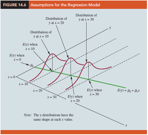 Figure 14.6 illustrates the model assumptions and their implications; note that in this graphical interpretation, the value of E(y) changes according to the specific value of x considered. However, regardless of the x value, the probability distribution of e and hence the probability distributions of y are normally distributed, each with the same variance. The specific value of the error e at any particular point depends on whether the actual value of y is greater than or less than E(y).