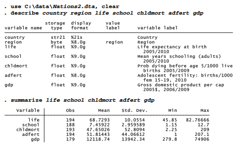 File Nations2.dta contains U.N. human-development indicators for 194 countries: . use C:\data\Nations2.dta, clear