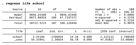 The lower half of the regression table gives the fitted model itself. We find coefficients (slope and y-intercept) in the first column. The coefficient on school is 2.45184, and the y-intercept (listed as the coefficient on _cons) is 50.35941. Thus our regression equation is approximately predicted life = 50.36 + 2.45school