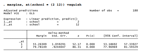 Mean years of schooling among these nations range from 1.15 to 12.7. What mean life expectancies does our model predict for nations with, for example, 2 or 12 years of schooling? The margins command offers a quick way to view predicted means along with their confidence intervals, and z tests (which often are not interesting) for whether those means differ from zero. A “vertical squish” vsquish option reduces the number of blank lines between rows in the table.