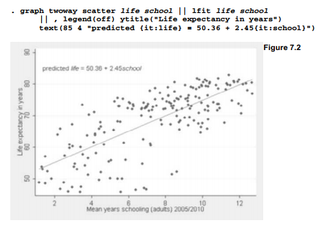 Figure 7.2 displays a nicer version, suppressing the unneeded legend, and inserting the regression equation as text. The variable names life and school illustrate how to italicize text in Stata graphs.