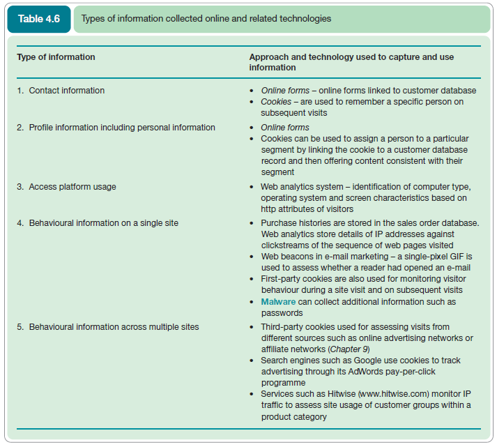 To help develop effective online services, we need to understand customers’ online buyer behaviour and motivation (this topic is considered in more depth in Chapter 9, p. 492). As we saw in Figure 4.1, finding information about goods and services is a popular online activity, but each organization needs to capture data about online influence in the buying process for their own market. Managers also need to understand how the types of sites shown in Figure 2.3 influence consumers, for example are blogs, social networks or traditional media sites more trusted?We can understand significant features of online buyer behaviour from research summarized in the AOL-sponsored BrandNewWorld (2004) study which showed that: