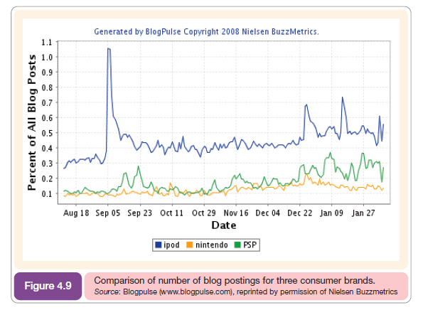 - Blog Pulse (blogpulse.com) gives trends and listings of any phrase (see example in Figure 4.9) and individual postings can be viewed