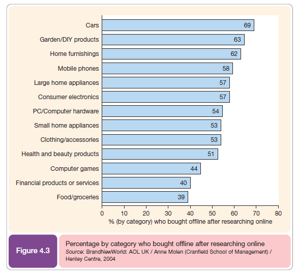 There is also a wide variation in influence according to type of product, so it is important to assess the role of the web in supporting buying decisions for a particular market. Understanding the potential reach of a web site and its role in influencing purchase is clearly important in setting e-marketing budgets. A different perspective on this is indicated by Figure 4.4 which shows the proportion of people who purchase offline after online research.