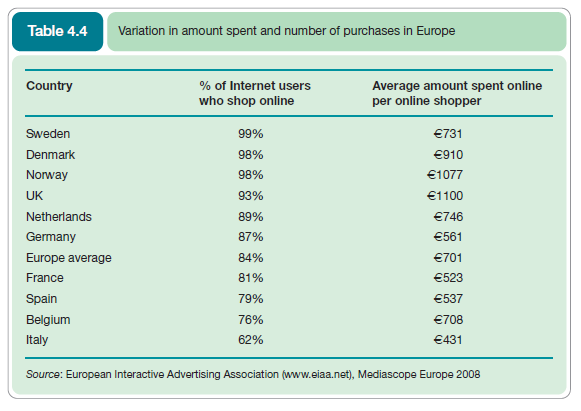 The extent of adoption also varies significantly by country according to other political, economic and cultural factors. Table 4.4 shows that there is a marked difference between the amount spent online in different countries which will affect revenue projections for site in different countries. It also shows the potential for further growth in e-commerce in countries where e-commerce adoption has been lower.