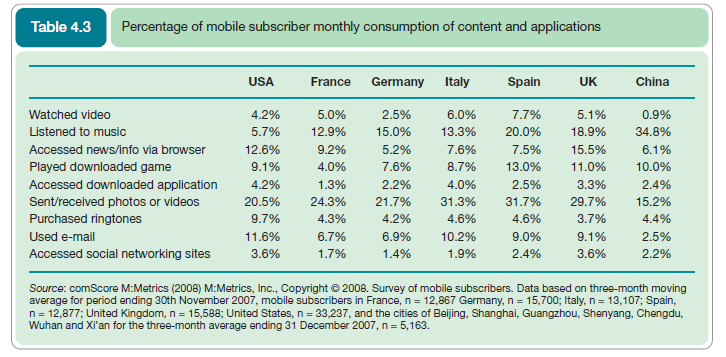 Variations in usage of mobile services are shown in Table 4.3. You can see that this type of data is vital for managers considering investment in mobile e-commerce services. Again there are large variations in usage of services in different countries, but with overall use of mobile applications relatively low.