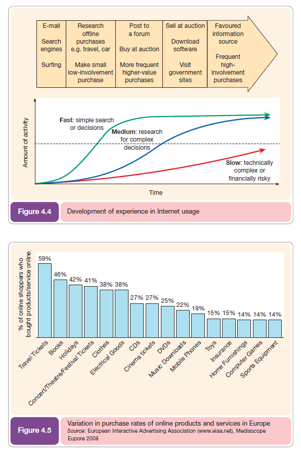 Increasing numbers of consumers are now purchasing online, but research on behaviour suggests it takes time for individuals to build up confidence to purchase. Frequency of purchase is also increased through adoption of the broadband Internet. Figure 4.4 shows that initially Internet users may restrict themselves to searching for information or using e-mail. As their confidence grows their use of the Internet for purchase is likely to increase with a move to higher-value items and more-frequent purchases. This is often coupled with the use of broadband. For this reason, there is still good potential for e-retail sales, even if the percentage of the population with access to the Internet plateaus.