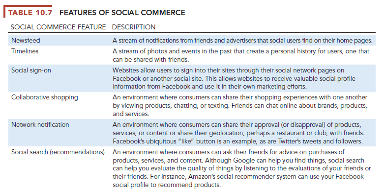 If you understand the interconnectedness of people, you will see just how important this concept is to e-commerce: The products and services you buy will influence the decisions of your friends, and their decisions will in turn influence you. If you are a marketer trying to build and strengthen a brand, you can take advantage of the fact that people are enmeshed in social networks, share interests and values, and communicate and influence one another. As a marketer, your target audience is not a million isolated people watching a TV show but the social network of people who watch the show and the viewers’ personal networks. Moreover, online social networks are where the largest Internet audiences are located. Table 10.7 describes the features of social commerce that are driving its growth.