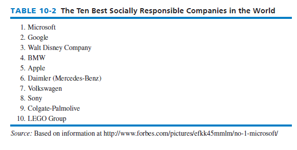 Forbes best companies globally in regard to being socially responsible are listed in Table 10-2. Former CEO Bill Gates, of the number-one ranked firm Microsoft, established the well-known Bill and Melinda Gates Foundation, which sets a high standard for any person or company.