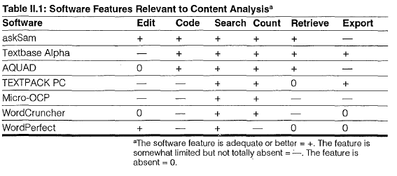 A word processing program, such as WordPerfect, is indispensable for carrying out a content analysis. It can be used to create a textual database for later use •with other programs, to edit an existing database, to attach codes necessary for content analysis, and to convert from a word processor format to ASCII format. Virtually all word processors can perform these tasks and their editing capabilities are usually much superior to the primitive editing features found in most specialized content analysis programs.