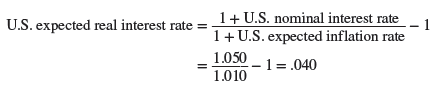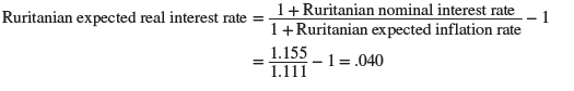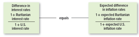 Now for the fourth leg! Just as water always flows downhill, so capital tends to flow where returns are greatest. But investors are not interested in nominal returns; they care about what their money will buy. So, if investors notice that real interest rates are higher in Ruritania than in the United States, they will shift their savings into Ruritania until the expected real returns are the same in the two countries. If the expected real interest rates are equal, then the difference in nominal interest rates must be equal to the difference in the expected inflation rates:[3]