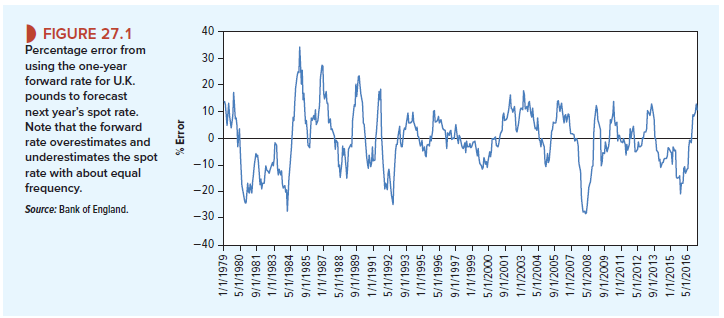 That’s the good news. The bad news is that the forward rate is a fairly awful forecaster of the spot rate. For example, in Figure 27.1 the large error in 1985 reflects the total failure of the forward rate to anticipate the 34% rise in the value of sterling.