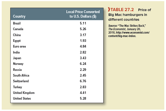 - Purchasing Power Parity Theory What about the third side of our quadrilateral— purchasing power parity theory? No one who has compared prices in foreign stores with prices at home really believes that prices are the same throughout the world. Look, for example, at Table 27.2, which shows the price of a Big Mac in different countries. Notice that at current rates of exchange a Big Mac costs $6.76 in Switzerland but only $5.28 in the United States. To equalize prices in the two countries, the number of Swiss francs that you could buy for your dollar would need to increase by 6.76/5.28 – 1 = .28, or 28%.
