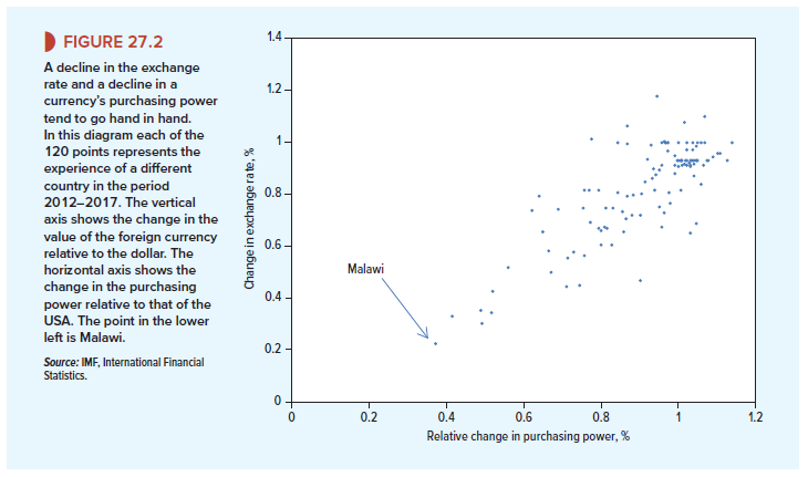 In Figure 27.2, we have plotted the relative change in purchasing power for a sample of countries against the change in the exchange rate. Malawi is tucked in the bottom left-hand corner. You can see that although the relationship is far from exact, large differences in inflation rates are generally accompanied by an offsetting change in the exchange rate.[8]