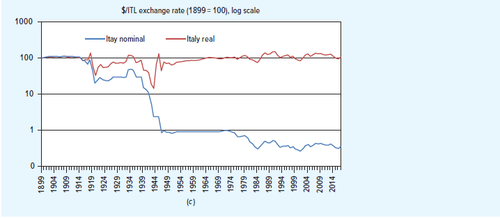 Strictly speaking, purchasing power parity theory implies that the differential inflation rate is always identical to the change in the spot rate. But we don’t need to go as far as that. We should be content if the expected difference in the inflation rates equals the expected change in the spot rate. That’s all we wrote on the third side of our quadrilateral. Look, for example, at Figure 27.3. The blue line in the first plot shows that in 2014 £1 sterling bought only 32% of the dollars that it did at the start of the twentieth century. But this decline in the value of sterling was largely matched by the higher inflation rate in the U.K. The red line shows that the inflation-adjusted, or real, exchange rate ended the century at roughly the same level as it began.[9] The second and third plots show the experiences of France and Italy, respectively. The fall in nominal exchange rates for both countries is much greater. Adjusting for changes in currency units, the equivalent of one French franc in 2014 bought about 1% of the dollars that it did at the start of 1900. The equivalent of one Italian lira bought about .4% of the number of dollars. In both cases the real exchange rates in 2014 are not much different from those at the beginning of the twentieth century. Of course, real exchange rates do change, sometimes quite sharply. For example, the real value of sterling fell by 13% in two weeks following the Brexit vote in 2017. However, if you were a financial manager called on to make a long-term forecast of the exchange rate, you could not have done much better than to assume that changes in the value of the currency would offset the difference in inflation rates.