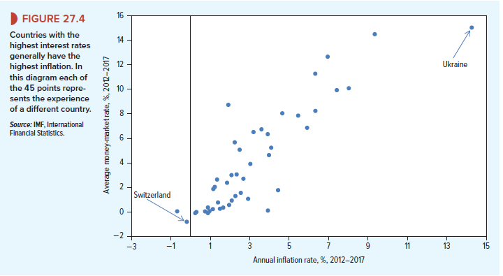 This is not an easy question to answer since we cannot observe expected inflation. However, in Figure 27.4, we have plotted the average interest rate in each of 45 countries against the average inflation rate. Switzerland is tucked into the bottom-left corner of the chart, while Ukraine is represented by the dot in the top-right corner. You can see that, in general, the countries with the highest interest rates also had the highest inflation rates. There were much smaller differences between the real rates of interest than between the nominal (or money) rates.