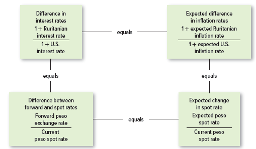 Suppose that individuals were not worried about risk and that there were no barriers or costs to international trade on capital flows. In that case, the spot exchange rates, forward exchange rates, interest rates, and inflation rates would stand in the following simple relationship to one another: