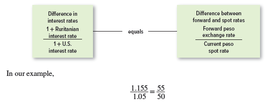 - Peso loan. The current exchange rate is RUP50/USD1. Therefore, for $1,000, you can buy 1,000 X 50 = RUP50,000. The rate of interest on a one-year peso deposit is 15.5%. Therefore, at the end of the year you get 50,000 X 1.155 = RUP57,750. Of course, you don’t know what the exchange rate is going to be in one year’s time. But that doesn’t matter. You can fix today the price at which you sell your pesos. The one-year forward rate is RUP55/USD1. Therefore, by selling forward, you can make sure that you will receive 57,750/55 = $1,050 at the end of the year.