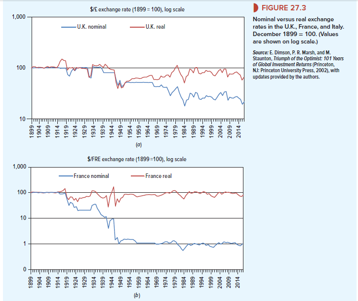 Strictly speaking, purchasing power parity theory implies that the differential inflation rate is always identical to the change in the spot rate. But we don’t need to go as far as that. We should be content if the expected difference in the inflation rates equals the expected change in the spot rate. That’s all we wrote on the third side of our quadrilateral. Look, for example, at Figure 27.3. The blue line in the first plot shows that in 2014 £1 sterling bought only 32% of the dollars that it did at the start of the twentieth century. But this decline in the value of sterling was largely matched by the higher inflation rate in the U.K. The red line shows that the inflation-adjusted, or real, exchange rate ended the century at roughly the same level as it began.[9] The second and third plots show the experiences of France and Italy, respectively. The fall in nominal exchange rates for both countries is much greater. Adjusting for changes in currency units, the equivalent of one French franc in 2014 bought about 1% of the dollars that it did at the start of 1900. The equivalent of one Italian lira bought about .4% of the number of dollars. In both cases the real exchange rates in 2014 are not much different from those at the beginning of the twentieth century. Of course, real exchange rates do change, sometimes quite sharply. For example, the real value of sterling fell by 13% in two weeks following the Brexit vote in 2017. However, if you were a financial manager called on to make a long-term forecast of the exchange rate, you could not have done much better than to assume that changes in the value of the currency would offset the difference in inflation rates.