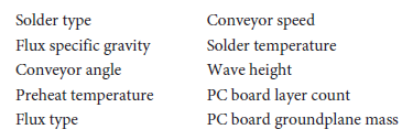 of process experimentation allows multiple factor adjustment simultaneously, shortening the total process, but equally as important, revealing complex interaction among the factors. A well-designed experiment can be concluded on a process such as wave soldering in 30 to 40 runs and will establish the optimum setting for each of the adjustable parameters for each of the selected factors. For example, optimal settings for conveyor speed, conveyor angle, wave height, preheat temperature, solder temperature, and flux specific gravity will be established for each PC board type, solder alloy, and so on.