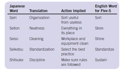 Five-S is a way of doing things that eliminates waste and reduces errors, defects, and injuries. A recurring comment from executives returning from visits to Japanese industrial plants in the seventies and eighties was that the Japanese plants were spotlessly clean and orderly and seemed far less chaotic than corresponding plants in the West. Much of that was the result of Hiroyuki Hirano’s Five-S philosophy. Five things must happen under Five-S, which are as follows: