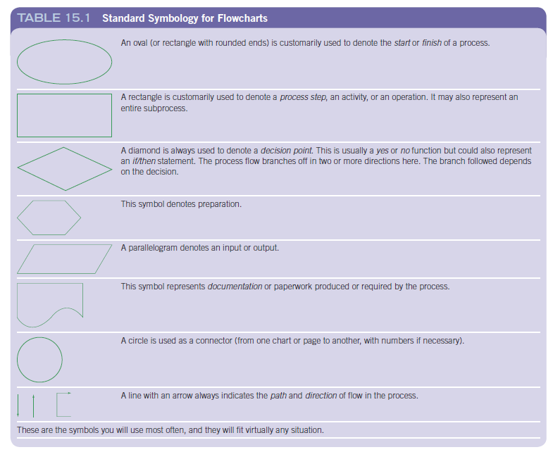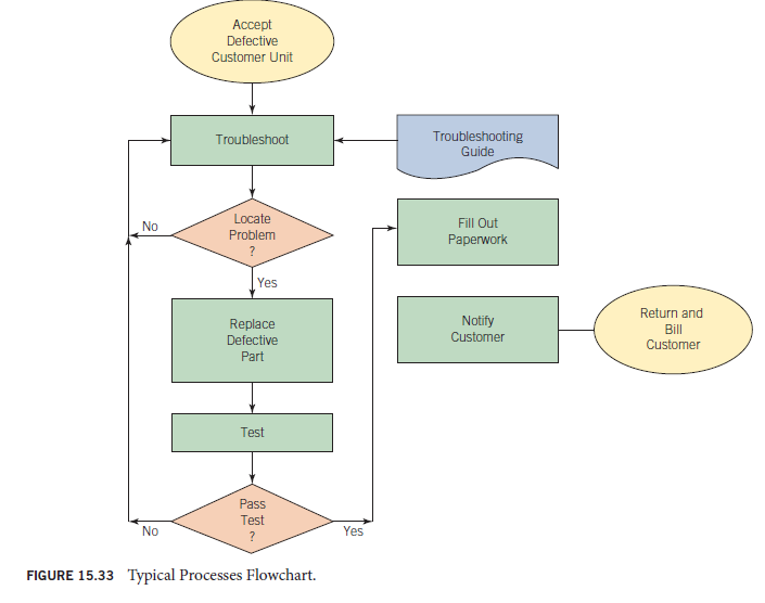 shown in Table 15.1. To illustrate their use, a simple flowchart using the most common symbol elements is given in Figure 15.33. Flowcharts may be as simple or as complex as you may need. For example, in Figure 15.33 the rectangle labeled “Troubleshoot” represents an entire subprocess that itself can be expanded into a complex flowchart. If an intent of the flowchart had been to provide information on the troubleshooting process, then each troubleshooting step would have to be included. Our purpose for Figure 15.33 was merely to chart the major process steps for receiving and repairing a defective unit from a customer, so we did not require subprocess detail. This is a common starting point. From this high-level flowchart, it may be observed that (a) the customer’s defective unit is received, (b) the problem is located and corrected, and (c) the repaired unit is tested. (d) If the unit fails the test, it is recycled through the repair process until it does pass. (e) Upon passing the test, paperwork is completed. (f) Following that, the customer is notified, and (g) the unit is returned to the customer along with a bill for services. With this high-level flowchart as a guide, your next step will be to develop detailed flowcharts of the subprocesses you want to improve. Only then can you understand what is really happening inside the process, see which steps add value and which do not, find out where the time is being consumed, identify redundancies, and so on. Once you have a process flowcharted, it is almost always easy to see potential for improvement and streamlining. Without the flowchart, it may be impossible.