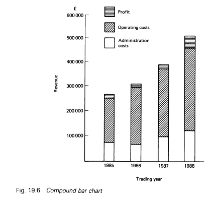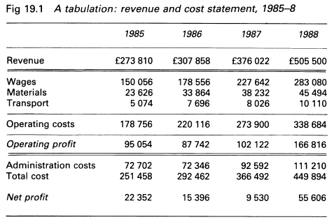 Figure 19.1 shows a tabulation of revenue and costs relating to a trading operation. As it stands many people might find this statement difficult to interpret. Presentation graphically adds to easy understanding.