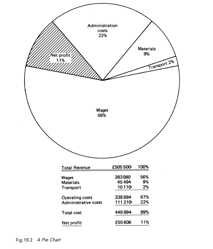 This is probably the most easily understood method of presenting figure information, requiring no comparisons with other figures. The illustration at Figure 19.2 represents the 1988 figures from the tabulation in Figure 19.1. A pie chart is often supported with a tabulation as shown but this is not absolutely necessary.