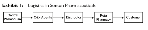 Sonton Pharmaceuticals Private Limited (Sonton) is a growing pharmaceutical company in India with a wide range of pharmaceutical products. Sonton boasts a line of 26 brands, including painkillers, diabetic, gastropa- thy, neuropathy, and cardiac products. Sonton’s logistics management was like that of any other pharmaceutical company in India: the manufactured pharmaceutical products went to the central warehouses of the company from the production department. From these warehouses, the products moved to the carrying and forwarding agents (C& F) in the different states, who in turn supply these to 240 distributors in the different parts of the country (refer Exhibit 1). These distributors then supply the products to the retail pharmacies all across the country. The products move to the final customers through these pharmacies.