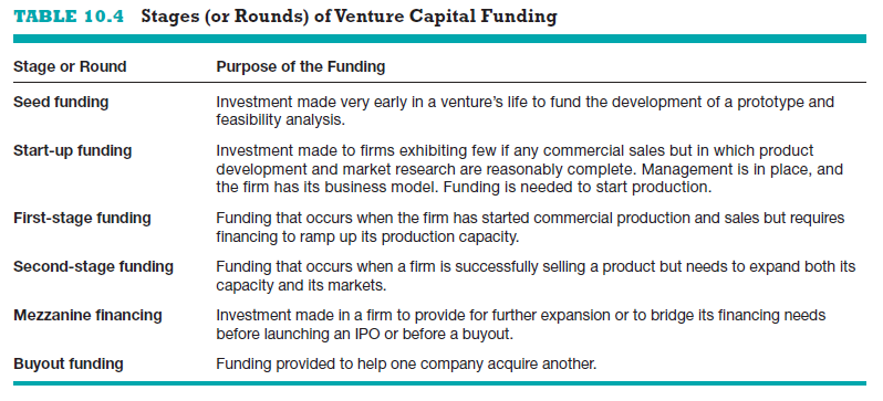 Still, for the firms that qualify, venture capital is a viable alternative to equity funding. An advantage to obtaining this funding is that venture capi- talists are extremely well connected in the business world (by this we mean that they have a large number of useful contacts with customers, suppliers, government representatives, and so forth) and can offer a firm considerable assistance beyond funding. Firms that qualify typically obtain their money in stages that correspond to their own stage of development. Once a venture capitalist makes an investment in a firm, subsequent investments are made in rounds (or stages) and are referred to as follow-on funding. Table 10.4 shows the various stages in the venture capital process, from the seed stage to buyout financing.