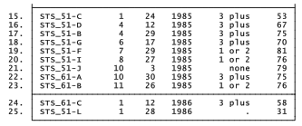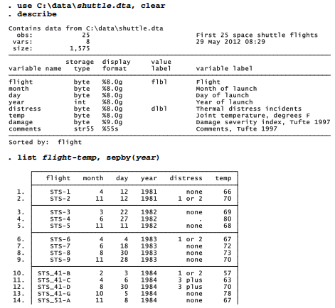 Our first example for this chapter, shuttle.dta, involves historical data covering the first 25 flights of the U.S. space shuttle. These data contain evidence that, if properly analyzed, might have persuaded NASA officials not to launch Challenger on its fatal flight in 1985 (the 25th shuttle flight, designated STS 51-L). The data are drawn from the Report of the Presidential Commission on the Space Shuttle Challenger Accident (1986) and from Tufte (1997). Tufte’s book contains an excellent discussion about data and analytical issues. His comments regarding specific shuttle flights are included as a string variable in these data.