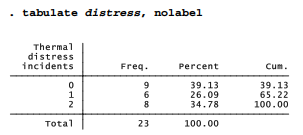 We can use these codes to create a new dummy variable, any, coded 0 for no distress and 1 for one or more distress incidents: