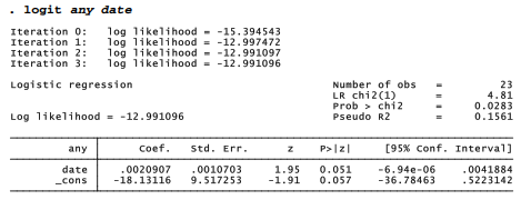 Less accurate, though convenient, tests are provided by the asymptotic z (standard normal) statistics displayed with logit results. With one predictor variable, that predictor’s z statistic and the overall /2 statistic test equivalent hypotheses, analogous to the usual t and F statistics in simple OLS regression. Unlike their OLS counterparts, the logit z approximation and /2 tests sometimes disagree (they do here). The /2 test has more general validity.