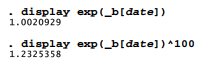 The coefficient in this logit example ( .0020907) describes date’s effect on the logit or log odds that any thermal distress incidents occur. Each additional day increases the predicted log odds of thermal distress by .0020907. Equivalently, we could say that each additional day multiplies predicted odds of thermal distress by e 0020907 = 1.0020929; each 100 days therefore multiplies the odds by (e 0020907 ) 100 = 1.23. (e » 2.71828, the base number for natural logarithms.) Stata can make these calculations utilizing the _b[varname] coefficients stored after any estimation: