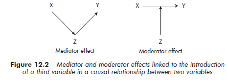 A moderator variable modifies the intensity (increasing or decreasing) and/or the sign of the relationship between independent and dependent variables (Sharma et al., 1981). The moderator variable enables researchers to identify when certain effects are produced and then to break down a population into subpopulations, according to whether the measured effect is present or not. Figure 12.2 schematizes the mediator and moderator effects relative to the introduction of a third variable in the relationship between independent and dependent variables.