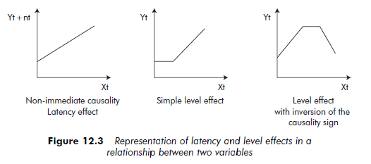 In a relationship between two variables, causality is not always immediate. Indeed, there can be a latent effect – a period during which the effect of a variable is awaited. This effect is particularly significant when researchers use correlation to test relationships between two temporal sets. They need to determine what period of time elapses between the cause and effect, and to separate the two series accordingly to conduct this test. It is possible that the relationship or causality will only be effective below a certain level. As long as the value of X remains below this level, X has no influence on Y (or there is no relationship between X and Y). When the value of X goes beyond this level, then X has an influence on Y (or there is a relationship between the two variables X and Y). An effect related to level may also influence the relationship’s sign. For example, below a certain level, the relationship is positive. Once this level has been attained, the sign is inverted and becomes negative. Figure 12.3 schematizes these different effects.