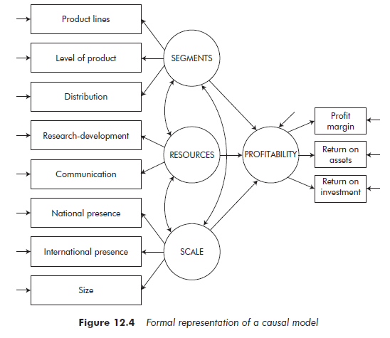 Figure 12.4 is an example of a formal representation of a model examining the relationship between strategy and performance. In this example, ‘product lines’ or ‘profit margin’ are directly observable variables, and ‘scale’ or ‘profitability’ are concepts (that is, variables that are not directly observable). The hypothesis is that three causal relationships exist between the concepts of ‘segments’, ‘resources’ and ‘scale’, on the one hand, and that of ‘profitability’ on the other. There is also assumed to be an association relationship between the three concepts ‘segments’, ‘resources’ and ‘scale’. Finally, all the directly observable variables contain terms of error as well as the concept of ‘profitability’.