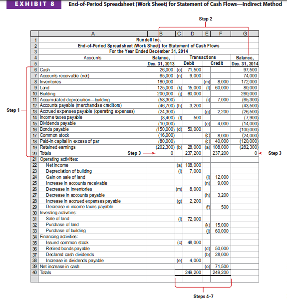 The data for Rundell Inc., presented in Exhibit 3 on pages 646-647, are used as a basis for illustrating the spreadsheet (work sheet) for the indirect method. The steps in preparing this spreadsheet (work sheet), shown in Exhibit 8, are as follows:
